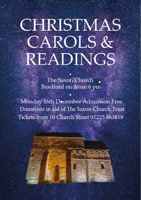 Monday 16 December, 6.00 pm. Come, sing and listen with a glass of mulled wine. Admission free but ticket required – from 10 Church Street (50 yards up from the Saxon Church) or ring 01225 863819. Donations afterwards in aid of the Saxon Church and the chapel at St Mary Tory.