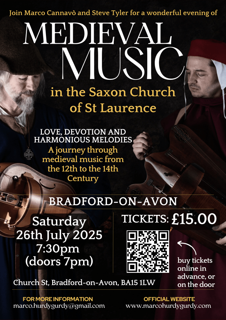 Saturday 26 July 2025. Visit http://www.marcohurdygurdy.com or scan the QR code above for more details and to book tickets